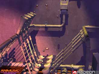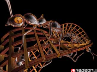 We created a new graphics rendering engine for these demos which we named the ATI Sushi Engine. This engine has three distinct pieces: 3D engine, character animation engine, and a shader library. The engine, like previous ones, compiles for DirectX 8.1 and OpenGL (for both Windows and Mac). We focused on DirectX 8.1 Vertex Shaders v1.1 and Pixel Shaders v1.4.